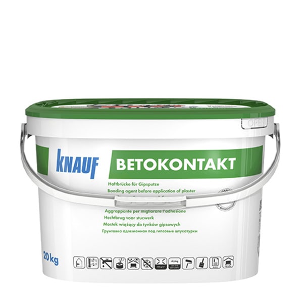 Грунтовка адгезионная КНАУФ-Бетоконтакт предназначена для обработки плотных, гладких, слабо- и не впитывающих влагу оснований, например, бетона, цементных штукатурок, пенополистирола, ЦСП, гипсовых пазогребневых плит под гипсовую штукатурку и гипсовую шпаклевку.